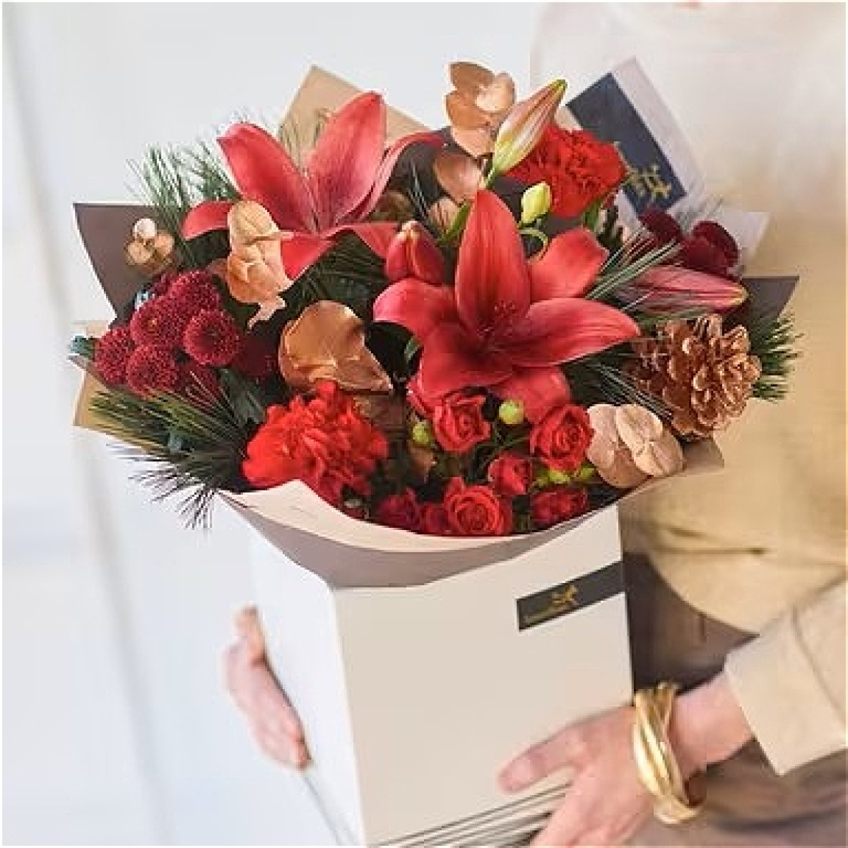 A beautiful classic Christmas bouquet made using a selection of red, Pink and cream flowers.