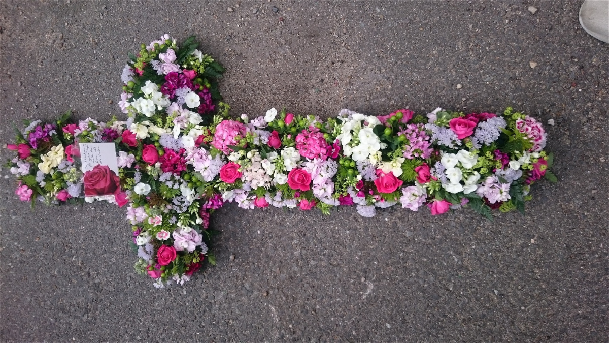 A beautiful loose cross tribute designed with fresh blooms arranged in a natural open style allowing each flowers shape and colour to shine.